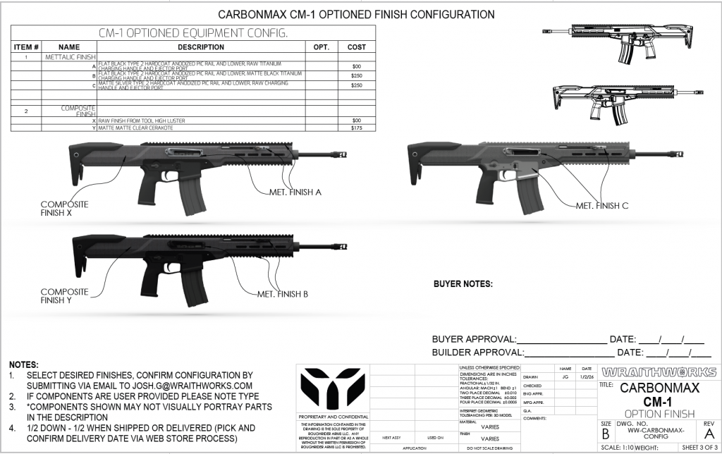 Optioned CM-1 rifles are priced on a per-build basis and finalized through a build-specific bill of materials and costed specification sheet approved by the customer prior to production.