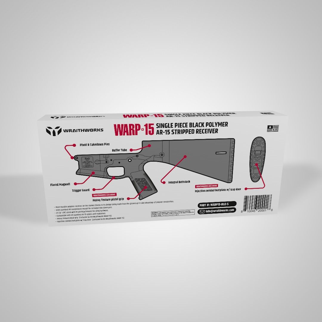 The WARP-15 is an AR15 style receiver made from injection molded glass filled nylon incorporating the buttstock, buffer tube, pistol grip, and trigger into the receiver design as integral components.